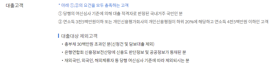 - 연소득 4500만원 이하이면서 개인신용평점 하위 20%에 해당하는 저신용자