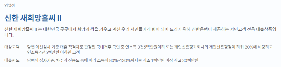 신한은행 새희망홀씨 대출은 1금융권 대출 상품을 이용하기에는 개인신용평점이 낮은 저신용자 및 저소득자 분에게 제도권 금융상품을 이용할 수 있도록 지원하는 정부지원 대출 상품입니다.