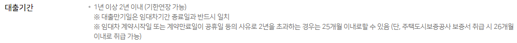 대출만기일은 임대차기간 종료일과 반드시 일치하여야하며, 임대차기간을 연장하는 경우 대출기간을 연장하여 이용할 수 있습니다.