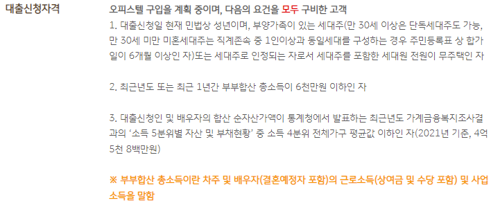 - 대출신청인 및 배우자의 합산 순자산 가액이 4억 5천 8백만원 이하인 분(2021년 기준이며, 22년 기준을 달라질 수 있음)