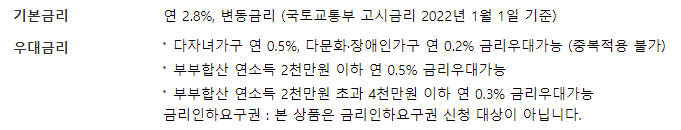 위의 기본 금리에 우대금리를 더해 연간 1.8%에서 2.8%의 금리가 적용될 수 있으니 참고하시길 바랍니다.