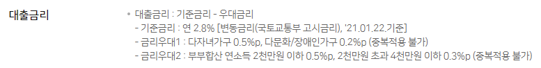 부부합산 연소득 6000만원 이하의 무주택 세대주가 주거용 오피스텔을 구입할 경우 낮은 금리로 대출을 지원하는 것이 특징입니다.
