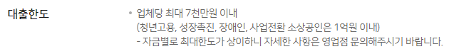 청년고용, 성장촉진, 장애인, 사업전환 소상공인은 최대 1억원 이내로 대출이 가능합니다.