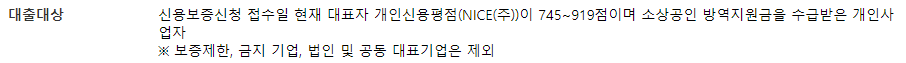 신용보증신청 접수일 현재 대표자 개인신용평점이 745점~915점이며, 소상공인 방역지원금을 수급받은 개인사업자가 신청할 수 있습니다.