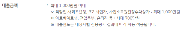 - 직장인 사회초년생, 초기사업자, 사업소득원천징수대상자 : 최대 1000만원