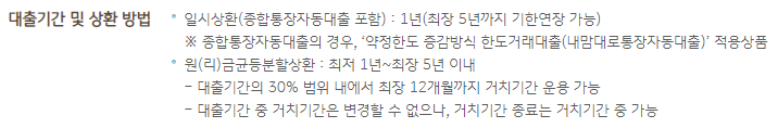 - 만기일시상환 : 1년, 만기전 연장신청을 통해 1년단위로 연장하여 최장 5년까지 기한연장 가능