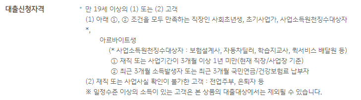 사회초년생, 아르바이트생, 은퇴자, 주부 등을 대상으로 지원하는 대출상품으로 일정 수준의 소득이 있는 분은 대출신청이 불가할 수 있습니다.