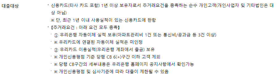 우리은행 무직자 대출은 신용카드(타사 신용카드 포함)를 1년 이상 보유하고 있으면서 우리은행 주거래 요건을 충족할 수 있는 분이 신청할 수 있습니다.