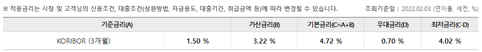 다만 위의 금리는 참고용이며, 실제 금리는 대출을 신청하시는 분의 개인신용평점 및 상환여력 등에 따라 개인별 차등 적용됩니다.
