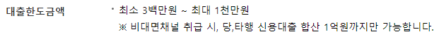 다만 비대면 채널로 대출 취급시 전 금융기관의 신용대출을 합산하여 최대 1억원까지만 가능하며, 그 이상인 경우 비대면 채널로 신청할 수 없고 영업점에 방문하여 신청할 수 있으니 참고바랍니다.