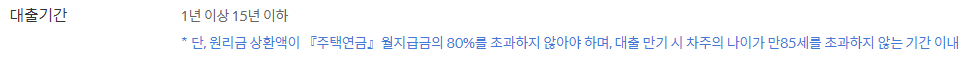 단 원리금 상환액이 주택연금 월지급금의 80%를 초과하지 않아야 하며 대출 만기시 대출을 신청하신 분의 나이가 만 85세를 초과하지 않는 기간이내에서 상환기간이 결정됩니다.