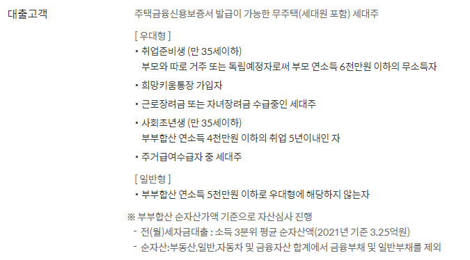 - 우대형 : 만 35세 이하의 취업준비생, 희망키움통장 가입자, 근로장려금 또는 자녀장려금 수급자, 사회초년생, 주거급여 수급자 중 세대주