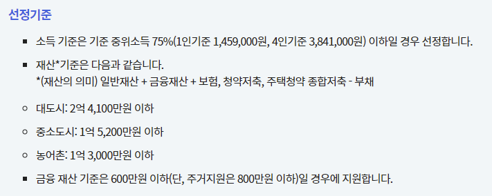 - 소득기준 : 기준 중위소득의 75% 이하 (1인기준 1,459,000원 이하, 4인기준 3,841,000원 이하)