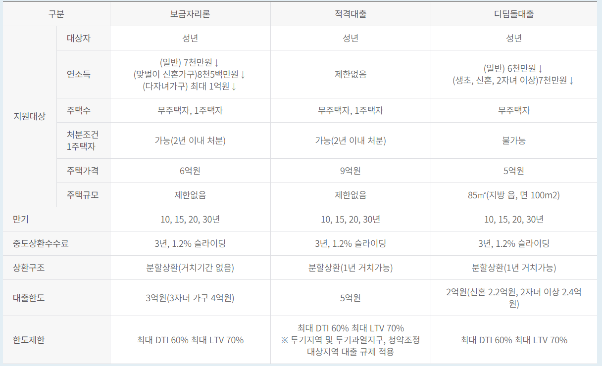 대출한도는 보금자리론이 3억원, 적격대출이 5억원, 디딤돌 대출이 조건 충족시 2억 4천만원까지이며, 한도제한은 3종류의 주택담보대출 모두 DTI 60%, LTV 70%를 적용하고 있으니 참고바랍니다.