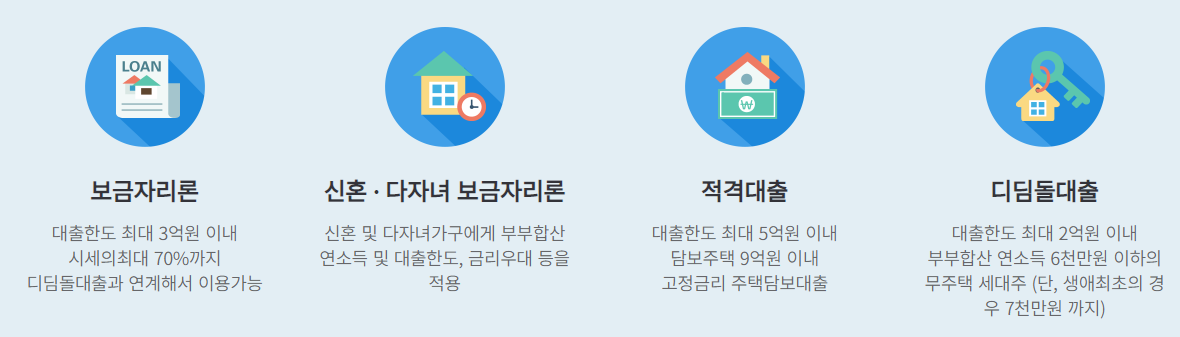 정부에서는 서민들의 내집마련을 위해 여러가지 주택담보대출 상품을 운영하고 있습니다. 오늘은 정부기관에서 운영하는 주택담보대출의 종류 및 신청자격, 대출한도, 대출금리, 대출기간등에 대해 이야기해보도록 하겠습니다.