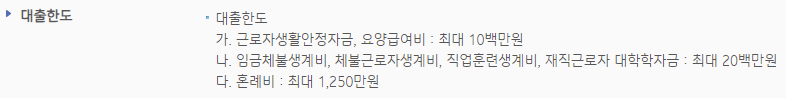 - 임금체불생계비, 체불근로자생계비, 직업훈련생계비, 재직근로자 대학학자금 : 최대 2000만원