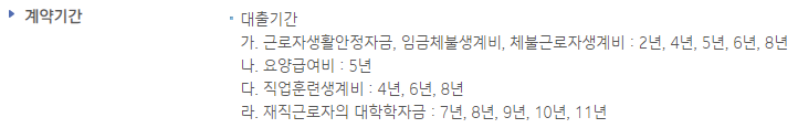 - 근로자 생활안정자금, 임금체불생계비, 체불근로자생계비 : 2년, 4년, 5년, 6년, 8년