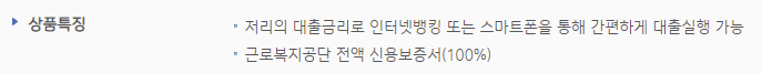 근로복지공단과의 협약을 통해 근로복지공단 신용보증서를 담보로 대출 취급이 가능하다는 것이 특징입니다.