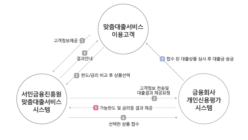 서민계층에서 대출과 관련하여 피해를 보지 않도록 서민금융진흥원과 제휴되어 있는 대출상품을 인터넷 및 모바일 앱으로 편리하게 비교하고 나에게 가장 적합한 대출상품을 추천하는 서비스가 맞춤대출 서비스입니다.