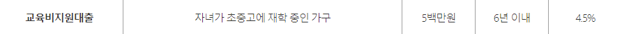 교육비지원대출은 초/중/고등학교에 재학중인 자녀가 있는 경우 자녀의 학비 및 학용품비, 학원비 등을 지원하는 정부지원 서민대출 상품입니다.
