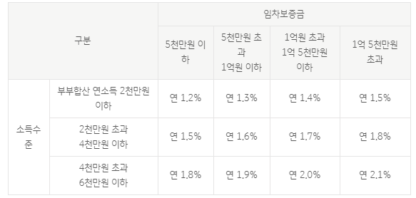 만약 신혼가구에 해당한다면 버팀목 전세자금대출의 금리가 더욱 낮아집니다. 부부합산 연간소득 구간 및 임차보증금에 따라 달라지지만 연간최저 1.2%에서 연간 최고 2.1%의 수준으로 금리가 책정되니 신혼부부에 해당한다면 신혼부부 버팀목 전세자금대출을 신청하시길 바랍니다.