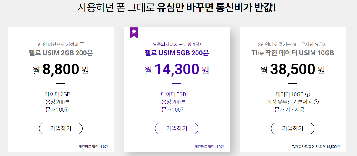 또한 월 8,800원의 요금으로 데이트는 2GB, 음성통화는 200분, 문자는 100건까지 이용할 수 있는 요금제도 있으니 참고하시길 바랍니다.