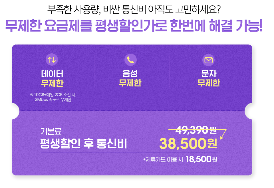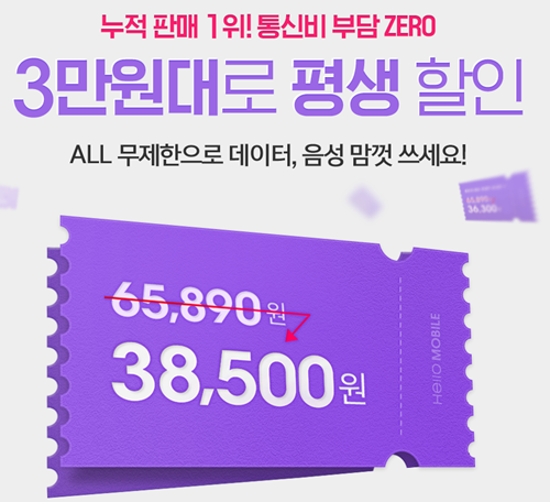 또한 데이터 및 음성, 문자 무제한 요금제를 38,500원에 사용할 수 있다는 것 역시 장점입니다. 일반 요금제로 무제한 요금제를 사용하려면 보통의 경우 65,000원 가량의 통신비가 나오지만 헬로모바일 데이터 무제한 요금제는 약 40% 가량 낮은 38,500원으로 무제한 요금제를 사용할 수 있습니다.