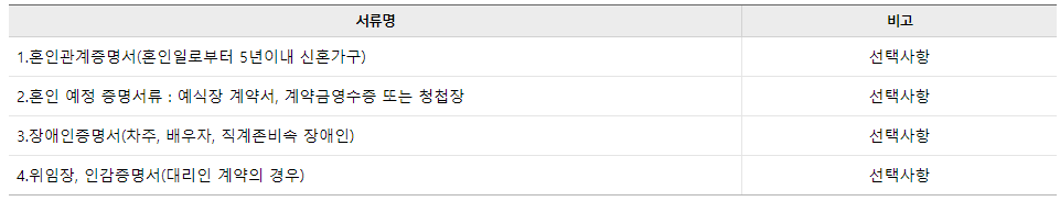 부부합산 소득요건 중 신혼가구 및 다자녀가구, 2자녀가구의 경우에는 6천만원 이하로 요건이 완화됩니다. 또한 혁신도시 이전 공공기관 종사자인 경우 역시 연간 총소득이 6천만원 이하로 조건이 완화되니 참고바랍니다.