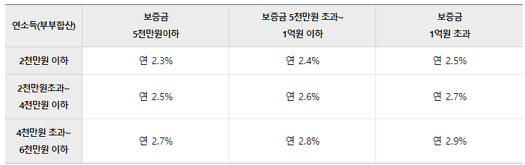 버팀목 전세자금대출을 서민을 위한 정부지원 대출 상품이기 때문에 연간소득이 낮을수록 낮은 금리를 적용하며, 임차보증금이 적을 수록 금리가 낮아지니 참고바랍니다.