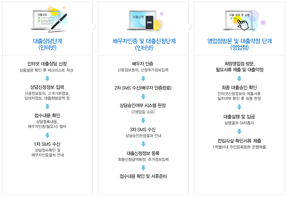 인터넷 대출상담신청 -> 상담신청정보 입력 -> 접수내용 확인 -> 배우자 인증 -> 상담승인여부 시스템 판정 -> 대출신청정보등록 -> 접수내용 확인 및 서류준비 -> 우리은행 영업점 방문 -> 필요서류제출 ->대출 약정 ->최종 대출승인 확인 -> 대출실행 및 입금 -> 전입사실 확인서류 제출