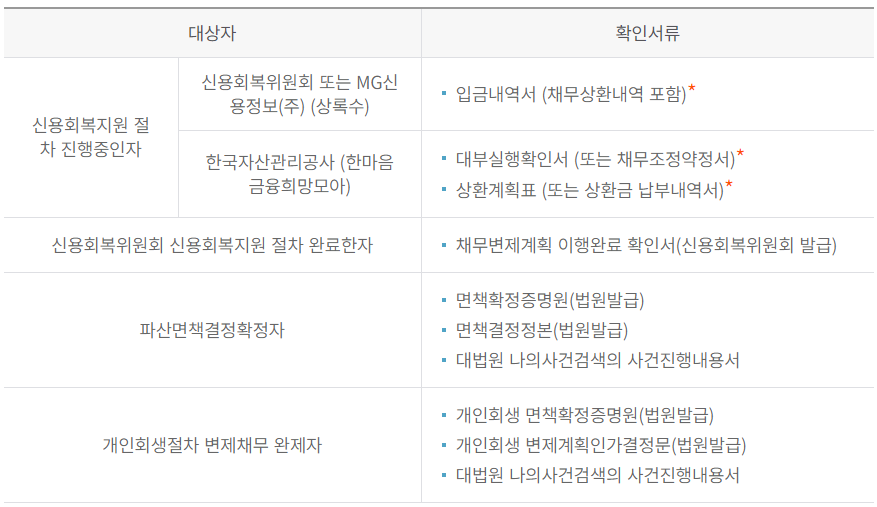 - 신청일 현재 신용관리정보 미보유자로 개인회생변제계획상의 변제채무를 완제 후 면책반든자로 변제계획인가결정일로부터 8년 이내인 분