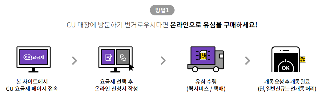 두번째 방법은 집근처의 가까운 CU편의점에서 유심을 구입 후 헬로모바일 사이트에 접속하여 CU요금제를 선택하고 구매한 유심 일련번호를 온라인으로 등록하고 개통 요청하면 1시간 내 개통이 완료됩니다. 두가지 방법 어떤 것을 사용해도 헬로모바일의 CU요금제를 이용할 수 있으니 편한 방법으로 사용하시면 되겠습니다.