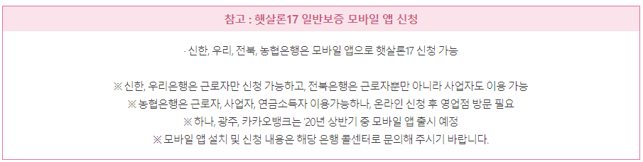 또한 신한은행, 우리은행, 전북은행, 농협은행은 모바일 앱으로 햇살론17 일반보증 신청이 가능하니 영업점 방문이 어려운 분께서는 모바일 앱을 이용하시길 바랍니다.