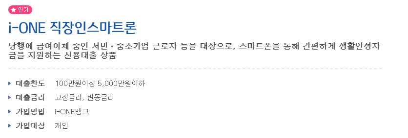 오늘은 기업은행 직장인 신용대출 상품인 i-one직장인 스마트론의 신청자격 및 대출한도, 대출기간, 대출금리등에 대해 알려드리도록 하겠습니다.