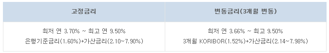 고정금리의 경우 연간 최저 3.70% ~ 9.50%로 적용받을 수 있고 변동금리의 경우 연간 최저 3.66% ~ 최고 9.50%로 적용받을 수 있습니다.