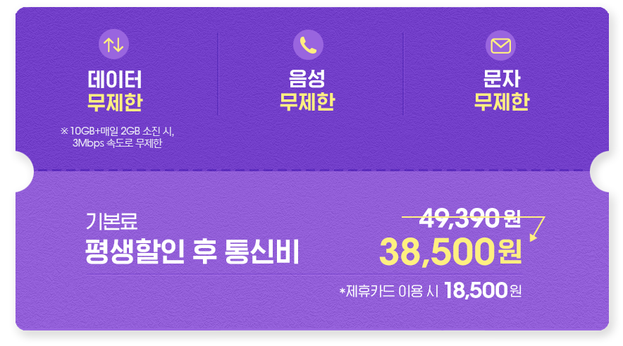 헬로모바일의 착한데이터 USIM 10GB 요금제 이벤트 할인시 기본료를 평생할인 받아 38,500원으로 데이터 무제한 요금제를 이용할 수 있으며, 제휴카드를 이용하여 통신비를 결제하면 한달 최저 18,500원에 이용할 수 있으니 참고바랍니다.
