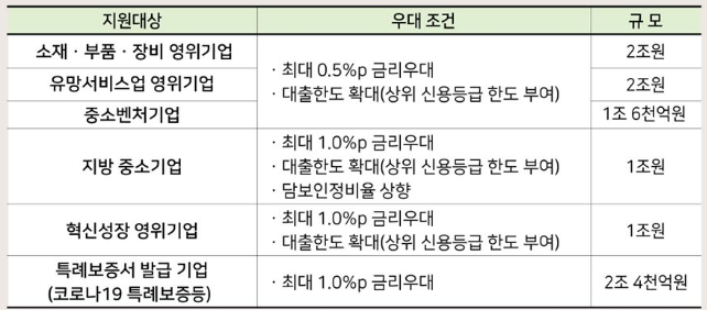 우대조건은 보증비율 90% 이상, 보증료율 0.2%P인하, 대상 기업 전액 만기연장등이며, 3월 31일부터 신청접수 및 지원을 하고 있으니 필요하신 기업에서는 신용보증기금 고객센터로 문의하시길 바랍니다.