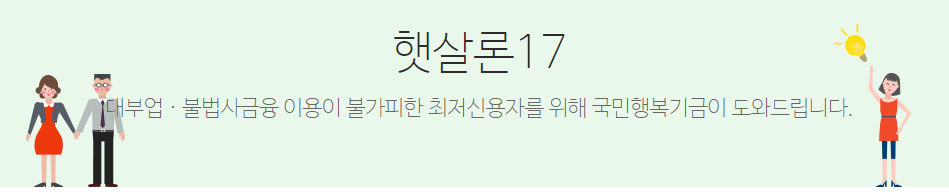 서민금융 통합지원센터 햇살론17은 대부업 및 불법사금융 이용이 불가피한 최저신용자를 위해 정부에서 만든 최저신용자 전용 서민대출 상품입니다.