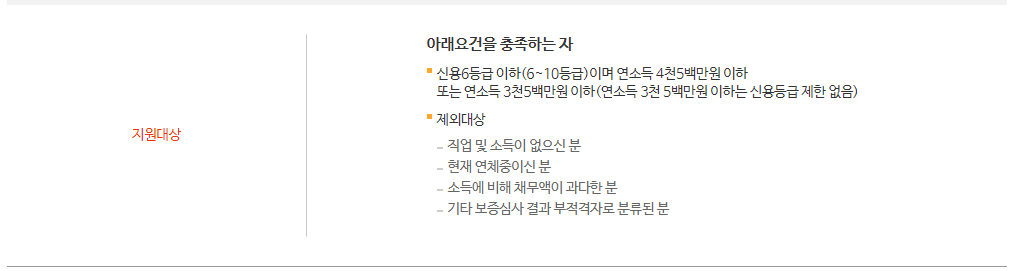 - 신용등급 6등급이하이면서 연간소득 4500만원 이하인분 또는 연소득 3500만원 이하인 분