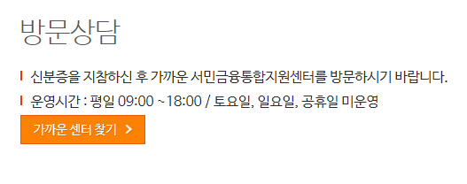 다만 방문상담의 경우 예약제를 원칙으로 하니 서민금융 통합콜센터로 방문상담 예약 후 내방하시는 것을 추천드립니다.