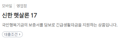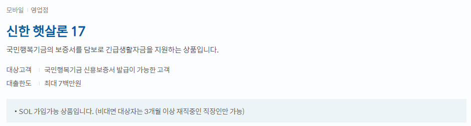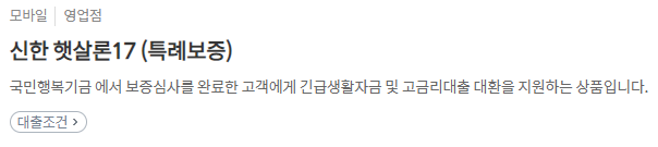 신한은행에서는 국민행복기금의 보증서를 담보로 최저신용자의 긴급생활자금을 지원하는 정부의 고금리대안자금 상품인 햇살론17을 취급하고 있습니다.