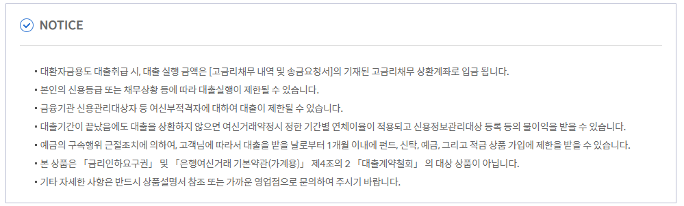 - 본인의 신용등급 또는 채무상황등에 따라 대출실행이 제한될 수 있습니다.