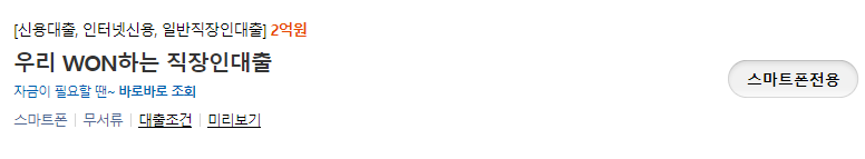 우리은행에서는 바쁜 직장인을 대상으로 우리은행 영업점의 방문없이 간편하게 신청할 수 있는 직장인 대출상품을 판매하고 있습니다.
